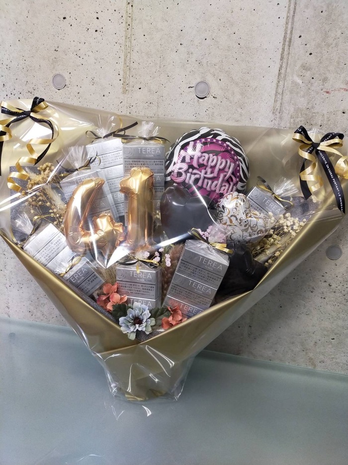 小さなバースデーバルーンとナンバーバルーンの組み合わせでラッピング。一段とボリュームアップ!